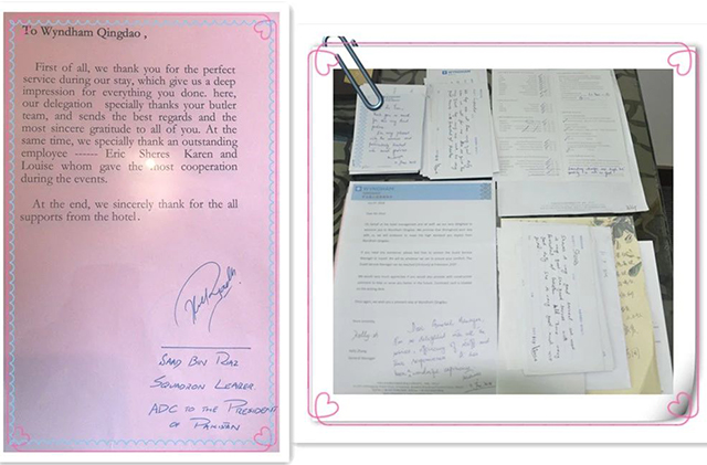 巴基斯坦總統(tǒng)馬姆努恩·侯賽因(Mr.Mamnoon Hussain)及貴賓一行對酒店的服務(wù)表示稱贊和滿意。峰會期間,酒店員工用心的服務(wù)收到了國內(nèi)外貴賓近40封表揚(yáng)信,臨別之時(shí),馬姆努恩·侯賽因總統(tǒng)更是贈送禮物,對酒店全體員工表示感謝。