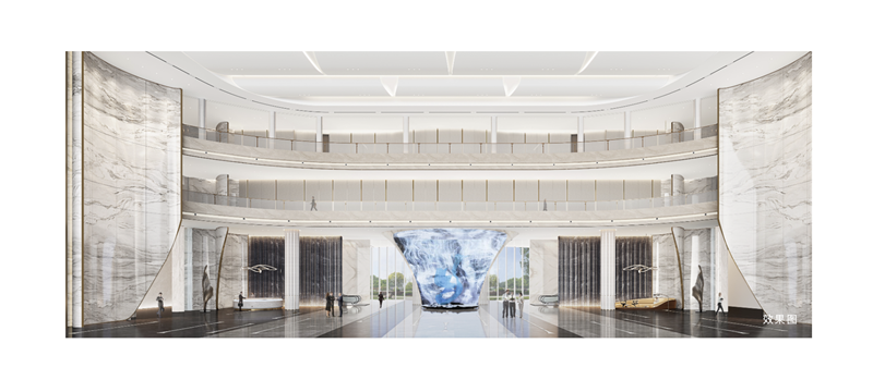 約2500㎡青島在建最大最高共享大堂,約18.8m高挑空,約58.8m無柱大跨度,青島在建最大、最寬、最高的共享大堂。